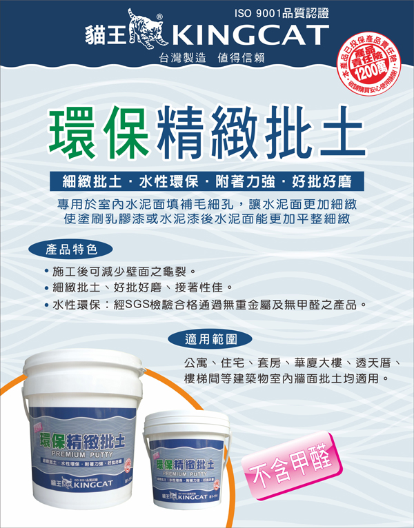 用了畢生積蓄買的小窩,總是希望裝潢完美,但是卻發現水泥牆面坑坑洞洞的、還有醜陋的釘子孔,看起來真不舒服啊!這款【貓王環保精緻批土1公升(白)】能有效幫助您改善這種情況喔!它是以環保高分子樹脂、與細緻碳酸鈣,添加特殊滑潤配方製成,專為室內水泥牆面填補孔隙之用喔! 您只需在粉刷油漆之前,用這款批土搭配刮刀,將批土緊密填封在水泥牆的孔隙中,等批土乾燥了之後,就形成了一個平滑面,此時您再開始粉刷油漆,就會發現整個牆面變得好平滑、好美觀!這款批土,附著力強、好批好磨,水性材料施工性能好,不含甲醛,無毒又環保。是您居家修繕的好法寶喔!