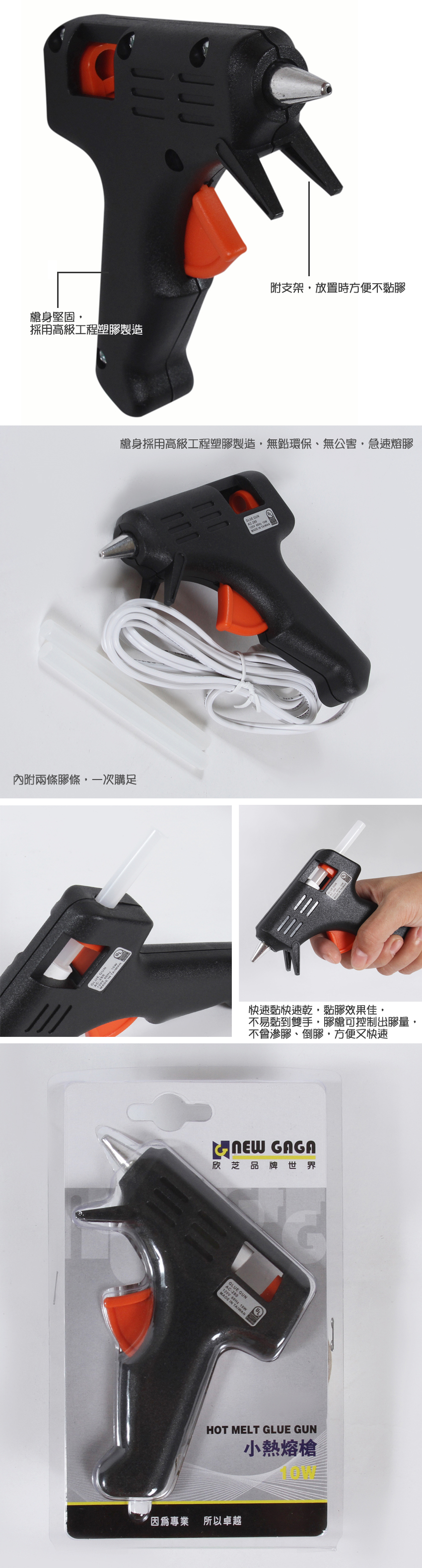 輕巧好操作小物品黏接、難黏的木頭材質等,建議您使用這款【10W 小熱熔槍】想要怎麼黏都可以,快速黏快速乾,黏膠效果佳,不易黏到雙手,膠槍可控制出膠量,不會滲膠、倒膠,方便又快速,不用在浪費等待的時間了,內附兩條膠條,一次購足,其槍身採用高級工程塑膠製造,無鉛環保、無公害,急速熔膠,槍身結構輕巧,操作舒適又安全,並附支架,放置時方便不黏膠。