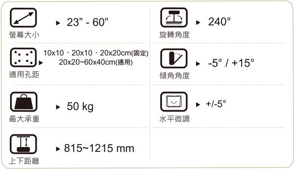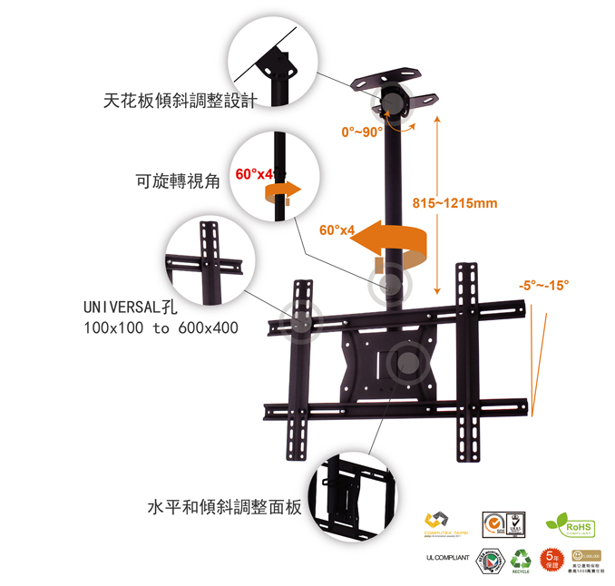 適用安裝23-60吋電視,最大承重50公斤,可左右240度旋轉,上下伸縮距離818-1215MM,並可微調面板左右水平,頭部調整傾斜角度設計可安裝於各種角度的天花板,緊固螺絲使用熱處理Class 8.8 級合金鋼,即使受到極大的外力也不容易斷裂。適用於餐廳.百貨公司.賣場等公共場所。