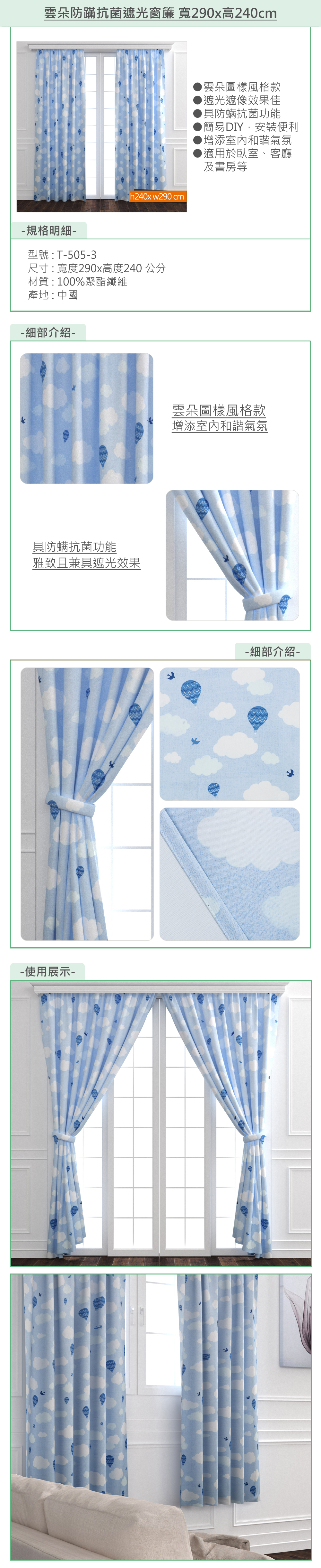 為您介紹這款【雲朵防蹣抗菌遮光窗簾寬 寬290x高240cm】,其遮光效果佳,為您的居家風格,打造不同的風采唷!採用100%聚酯纖維,簡雅印花圖案設計簡約素雅,讓您的居家空間更有質感與氣氛!實用性高,具有遮光、防螨以及抗菌功用,簡易DIY,安裝便利,適用於臥室、客廳、及書房等,是您居家美化、節能省碳的好幫手。