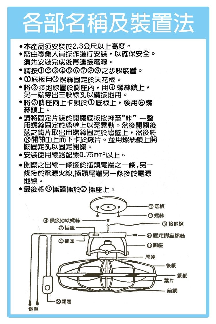 4.旋轉扇轉動時,請勿將手指或其他物品深入護網中。
