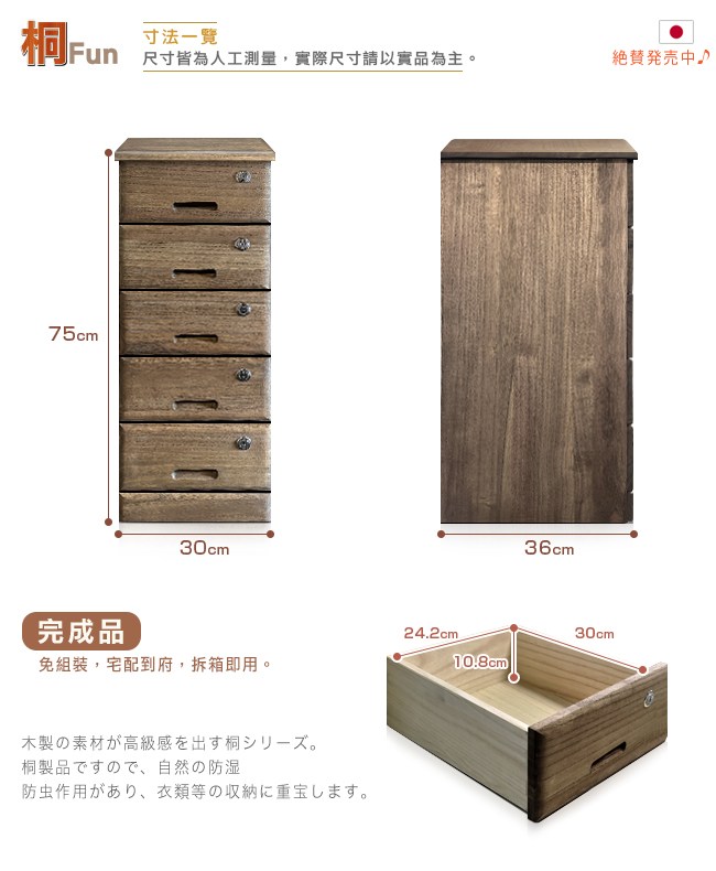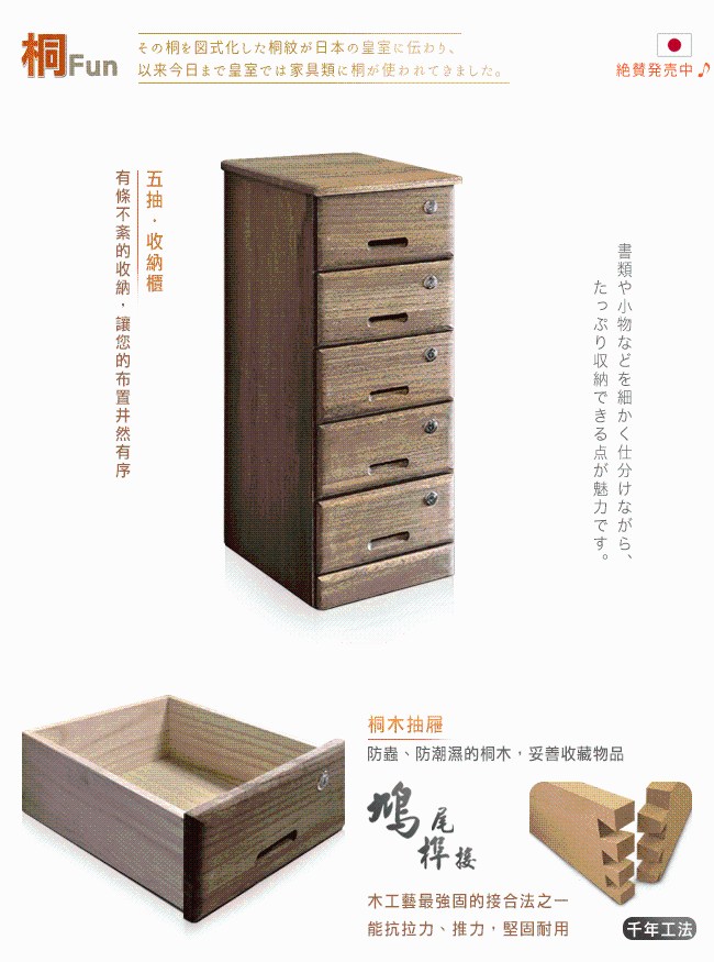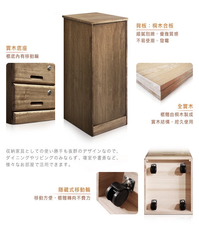 為生活的幸福感而設計,愛上收納就從現在開始。無銳角邊緣不刮手,安心使用。精雕細琢的內嵌實木把手,好品味之外,開闔順暢好拉取。五層抽屜均有鎖鑰保護貴重品。收納 A4 文件,空間井然有序不紛亂。細膩紋理的桐木抽屜內,珍藏了每件物品,均有專屬自己的位置、回憶與故事性。抽屜使用傳統榫接工法,堅固耐用。美背設計,不易受潮發霉。實木底座,隱藏式移動輪,移動方便,櫃體轉向不費力。