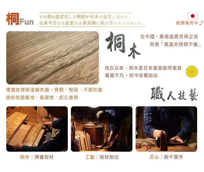 桐木特性重量輕、吸潮、透氣性好、不易變形、結構穩定性強、顏色好看。木材紋理通直,刨光後有絹絲光澤。桐木有很好的象徵意義,象徵富貴,被認為是高級木材之瑰寶。自古以來,是日本皇室御用的傢俱,尊貴不凡,而今依舊如此。
