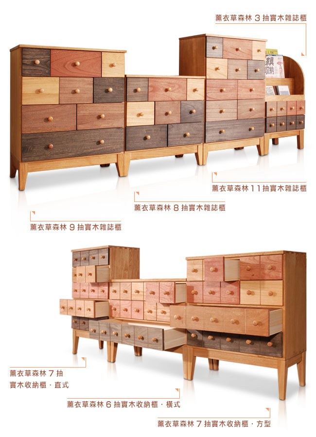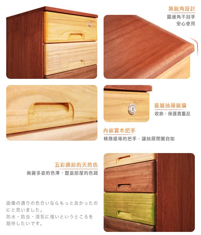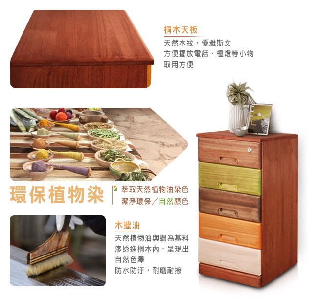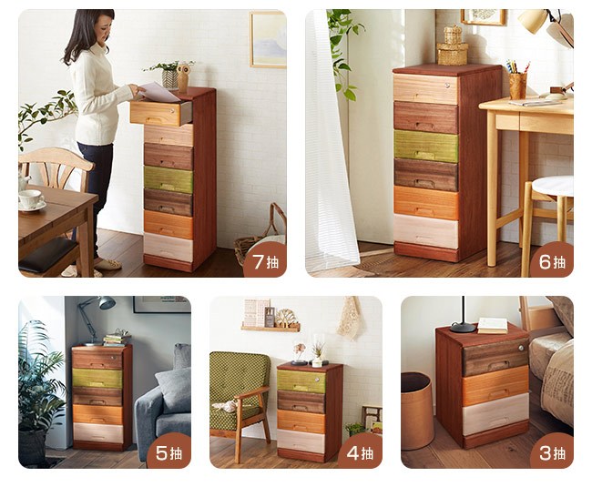 五彩繽紛的植物染,相映成趣。首層抽屜鑰匙鎖,保護個人隱私,收藏貴重品。抽屜下方的內嵌實木把手,好品味之外,開闔順暢好拉取。抽屜使用傳統榫接工法,堅固耐用。美背設計,不易受潮發霉。單純和輕復古的北歐風格,演繹了收納櫃在居家的魅力氛圍,除了實用,還充滿活力。成就居家美學的細膩度,收納達人的樂活life,不需理由就愛上了收納的奇幻之旅。