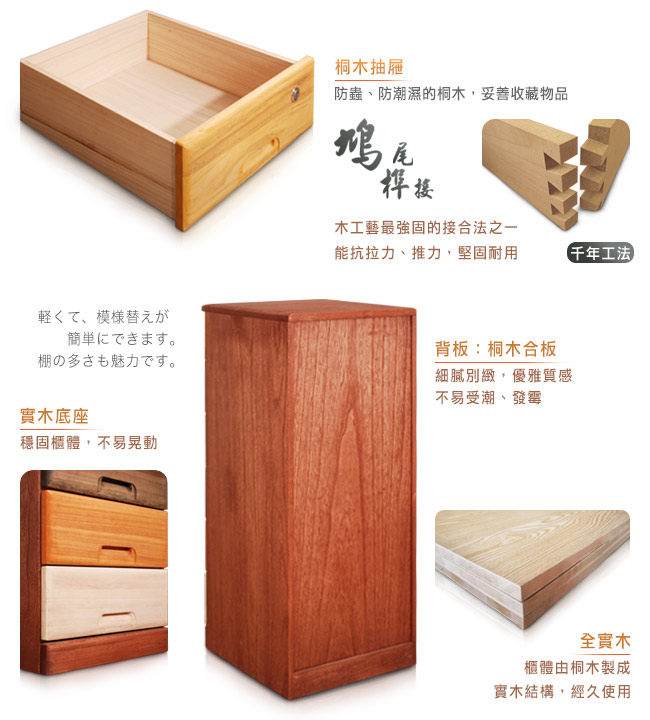 桐木實木醇厚大器,雋永質感,絕色驚豔;北歐色調襯托生活不凡品味,隨性搭配的森林系大地色彩,創造無限想像的巧思空間。擺放各類大小物品隨心所欲、斗櫃、文件櫃、收納櫃…各種用途因地制宜、因人而異。收納夏衣冬服、置放各類物品,每格抽屜都是一則故事、收納之間趣味盎然,傳統老工匠的榫接工藝,依據桐木原木特性設計創作,職人精神的手工、北歐獨特的風格、質感上乘的細節、豐富變化品味極致;融入於空間,遇見了美好。