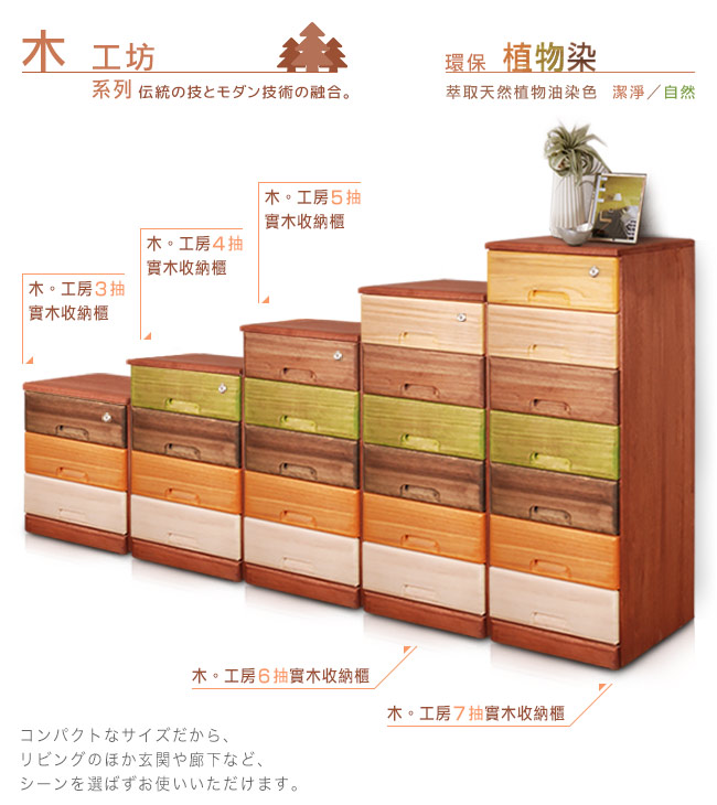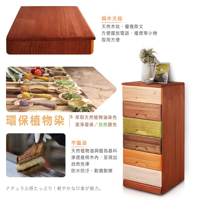 五彩繽紛的植物染,相映成趣。首層抽屜鑰匙鎖,保護個人隱私,收藏貴重品。抽屜下方的內嵌實木把手,好品味之外,開闔順暢好拉取。抽屜使用傳統榫接工法,堅固耐用。美背設計,不易受潮發霉。單純和輕復古的北歐風格,演繹了收納櫃在居家的魅力氛圍,除了實用,還充滿活力。成就居家美學的細膩度,收納達人的樂活life,不需理由就愛上了收納的奇幻之旅。