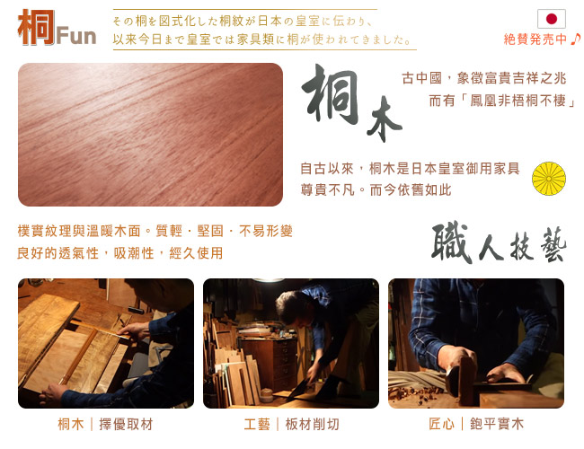 桐木質輕且不透濕氣,少分叉和歪斜,其木質特色特別適合台灣海島型潮濕氣候。特性重量輕、吸潮、透氣性好、不易變形、結構穩定性強、顏色好看。木材紋理通直,刨光後有絹絲光澤。桐木有很好的象徵意義,象徵富貴,被認為是高級木材之瑰寶。自古以來,是日本皇室御用的傢俱,尊貴不凡,而今依舊如此。