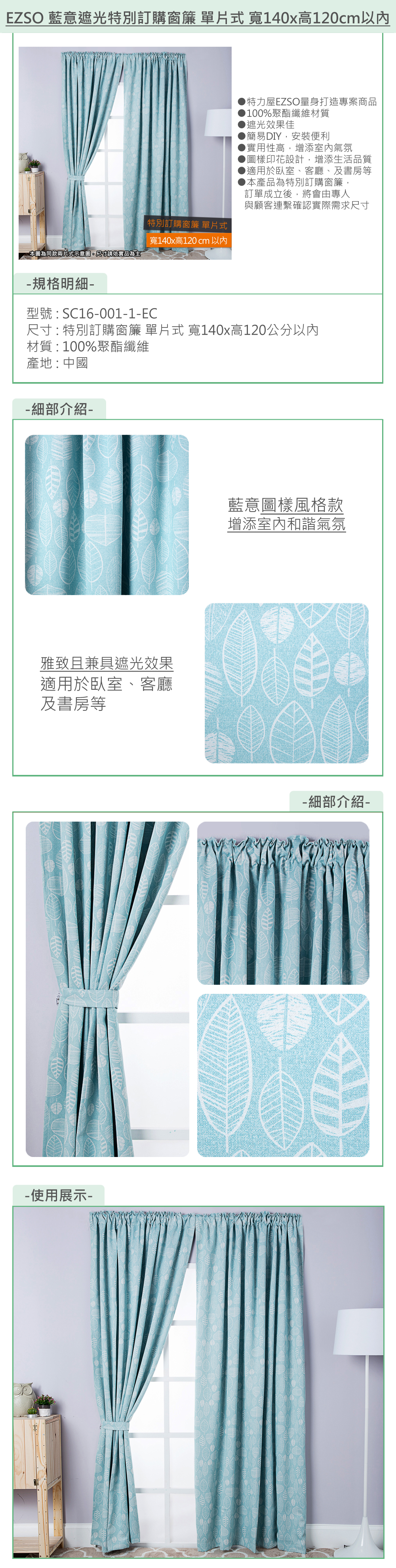 這款【EZSO 藍意遮光特別訂購窗簾 單片式 寬140x高120cm以內】遮光效果佳,圖樣印花設計增添居家品質,為您居家風格打造不同的風采。