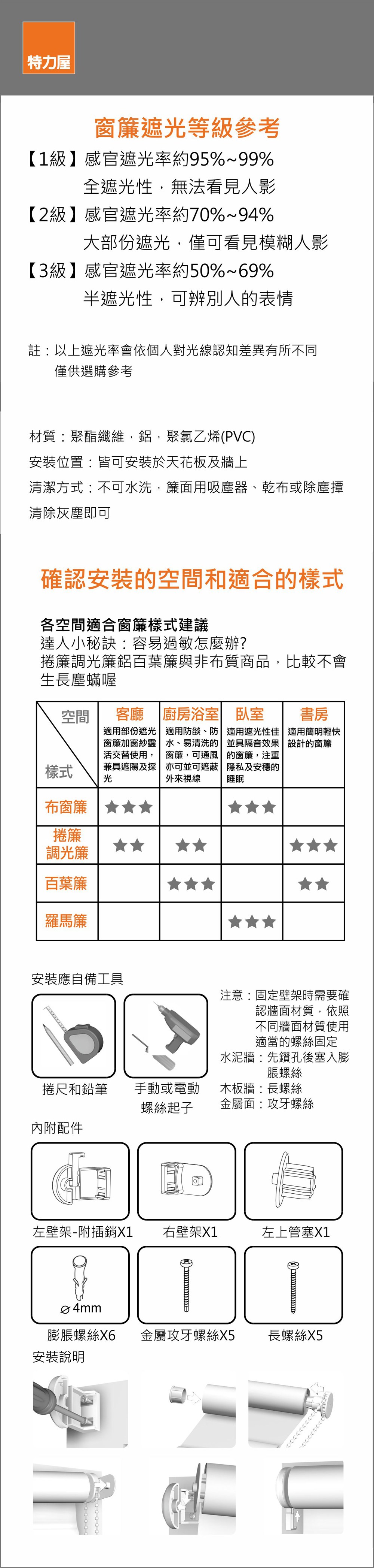 ● 清潔方式:本商品不可水洗,簾面可用吸塵器、乾布或除塵撢清除灰塵即可,勿用溼布擦拭, 以免造成汙漬或皺褶產生。
