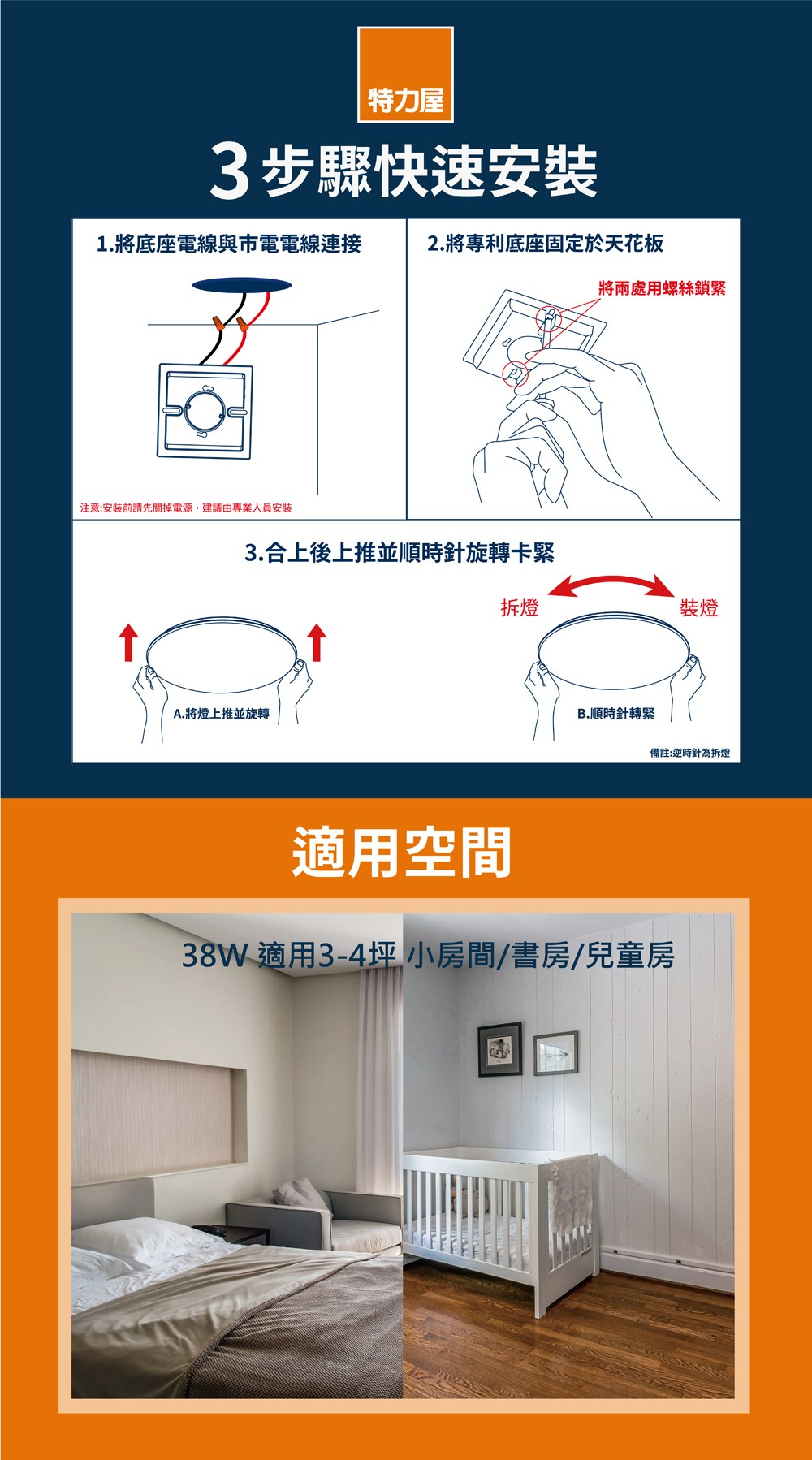 ● 燈盤超過60cm以上屬於大型尺寸燈具,因安全性考量,安裝、拆卸請洽詢門市專業師傅。