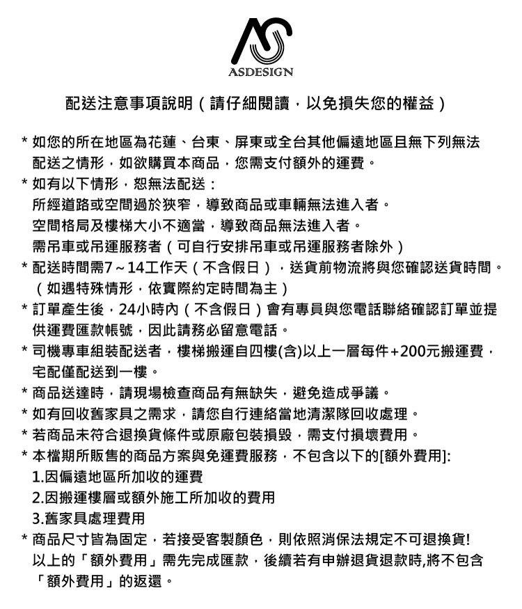 ※樓層費:樓梯一至三樓如可搬運則不收,四樓(含)以上每件每層樓收取200元樓層費。(有電梯則不收)