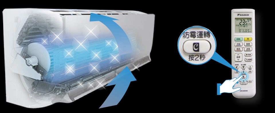 停止冷房運轉或除濕時,會自動運行風扇運轉一小時,使室內機的內部乾燥,以減少發霉和異味的產生。 這個功能也可以手動操作。 如果在空調停止時按下按鈕,將開始防霉運轉。