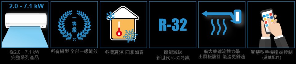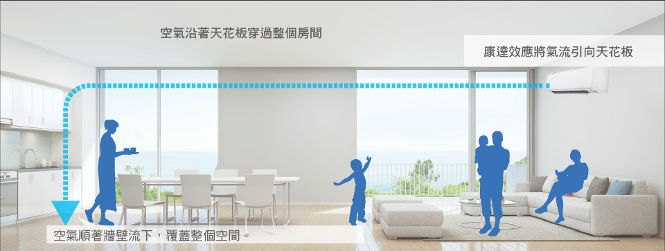 業界首創航太Coanda Effect康達效應技術,使天花板上產生氣流,促使空氣可以散佈到整個房間,讓空調氣流更舒適。