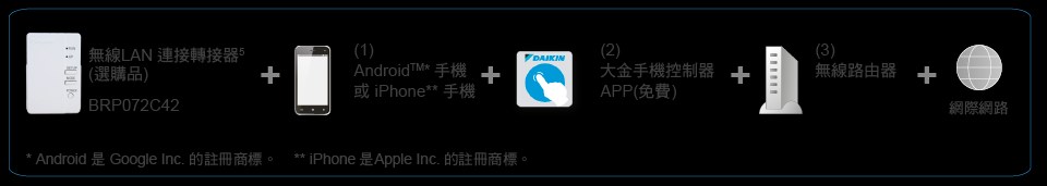 1. 行動手機適用的操作系統,請上大金官網查詢。需要網路連線來使用此服務。標準的智慧型手機使用大金行動控制器APP 應用程序來監視或控制空調時或許會有電信費用產生。