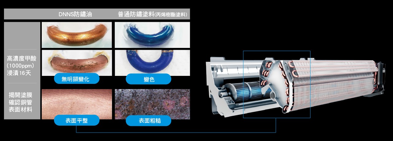 DNNS防鏽油具有不易消失甚至高自行修復機能特性,保護銅管防霉防腐蝕,並延長機器使用壽命。