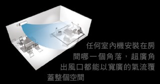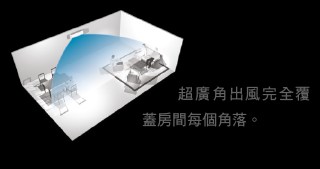 無論室內機安裝在房間哪一個角落,超廣角出風口都能以寬廣的氣流涵蓋整個空間。