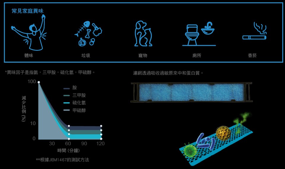 除臭濾網(酶藍)吸收蛋白質過敏原,並溶解蛋白質的鍵,將溶解的蛋白質變得無害。 除臭濾網(酶藍)能夠在1小時內去除異味,尤其是4種常見家庭異味* 90%**。