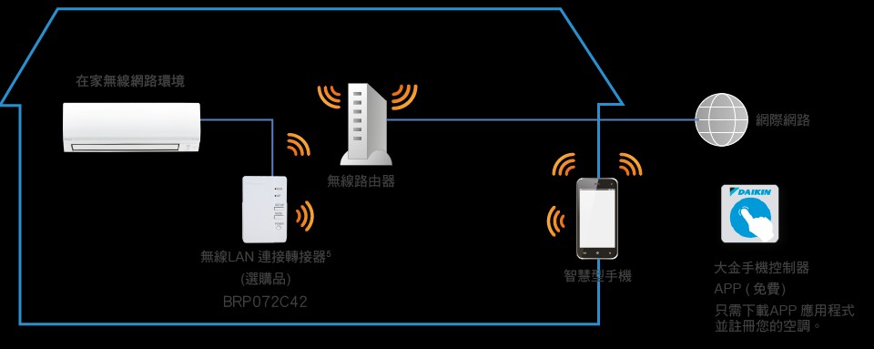 2. 在家庭使用大金空調手機APP 應用程式將取決於您家裡網絡的有效覆蓋區域。