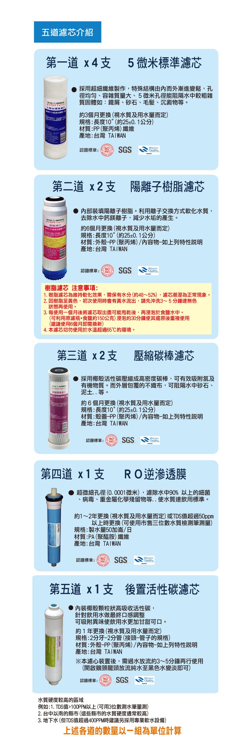 第四道-RO膜-約1~2年更換 / 第五道-後置活性碳-約1年更換