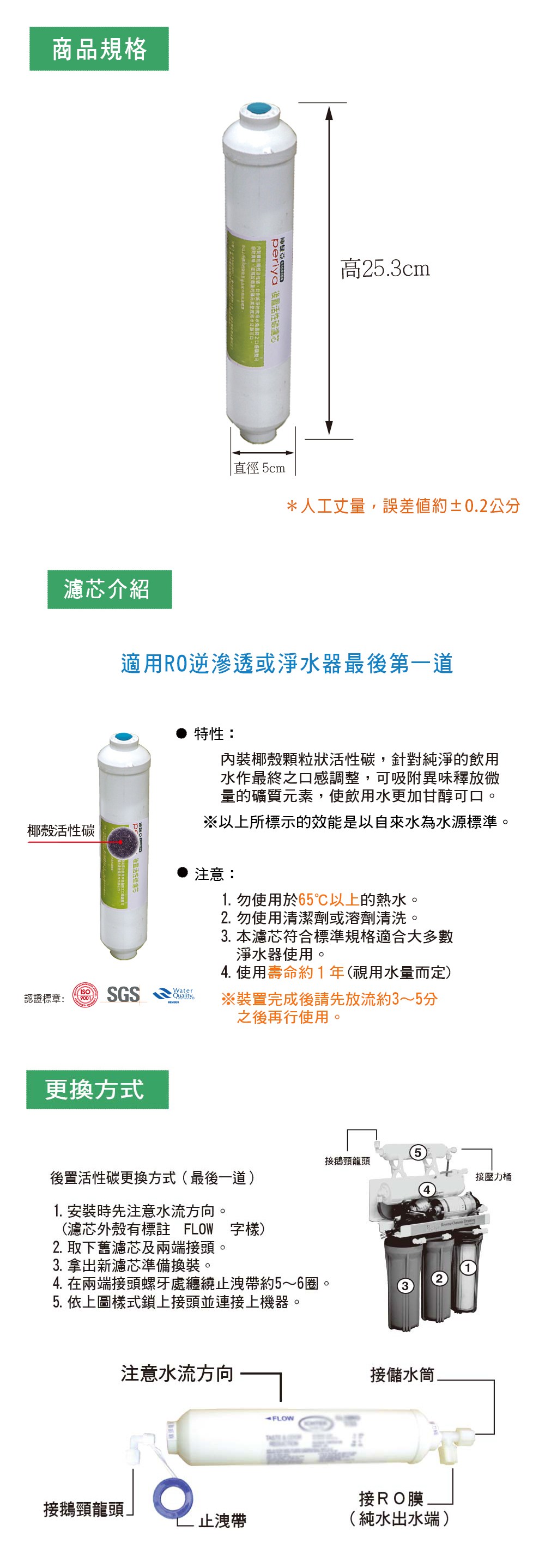 此款濾芯內裝椰殼顆粒狀活性碳.可吸附異味釋放微量的礦質元素;針對純淨的飲用水作最終之口感調整.可使飲用水更加甘醇可口。