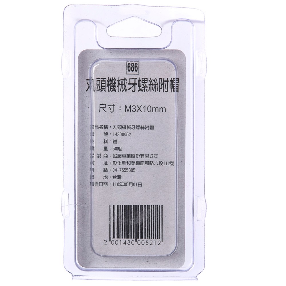 型號686 丸頭機械牙螺絲 附帽 M3X10mm 50組
