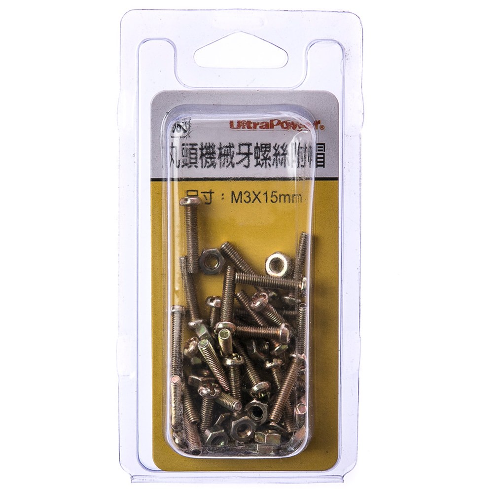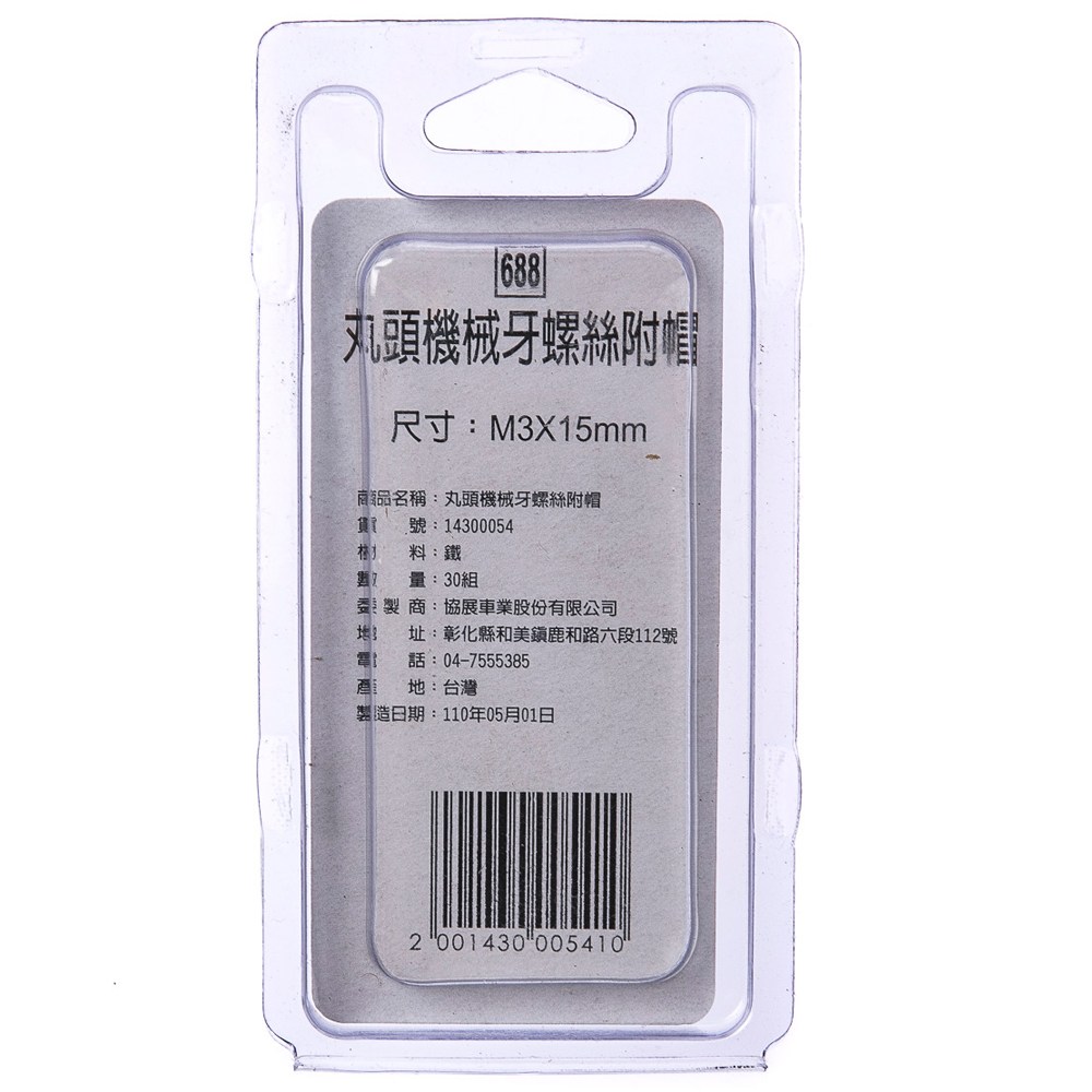 型號688 丸頭機械牙螺絲 附帽 M3X15mm 30組