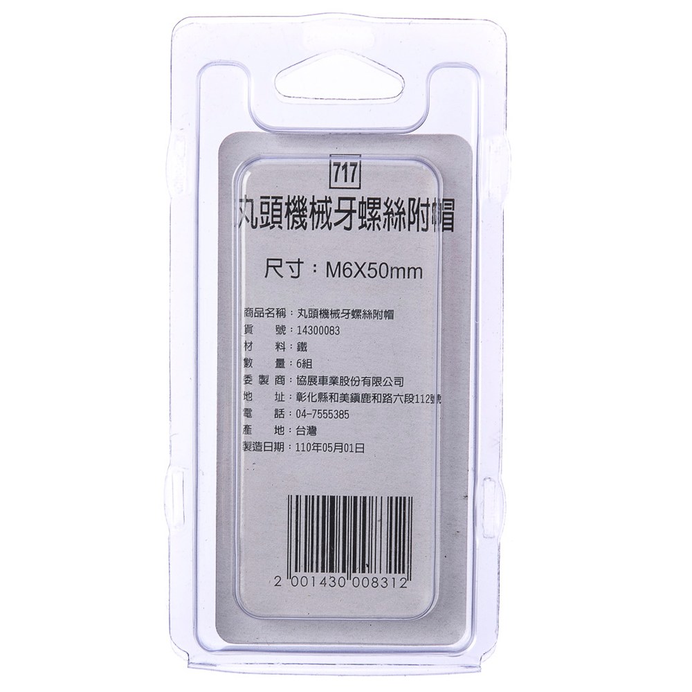 型號717 丸頭機械牙螺絲 附帽 M6X50mm 6組