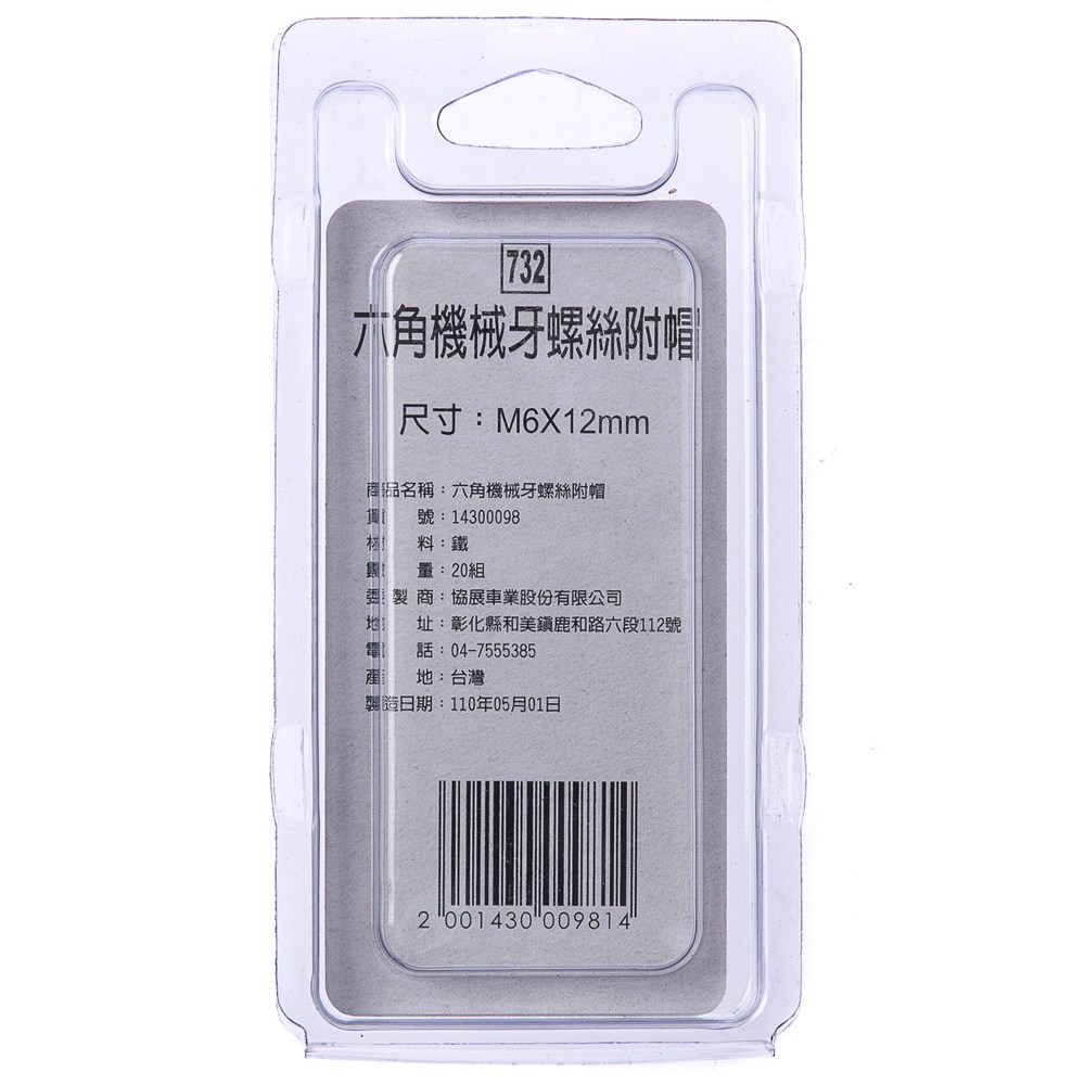 型號732 六角機械牙螺絲 附帽 M6X12mm 20組