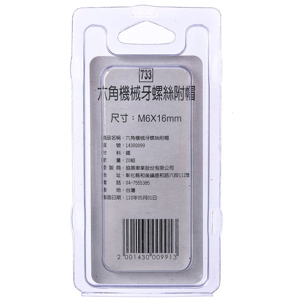 型號733 六角機械牙螺絲 附帽 M6X16mm 20組