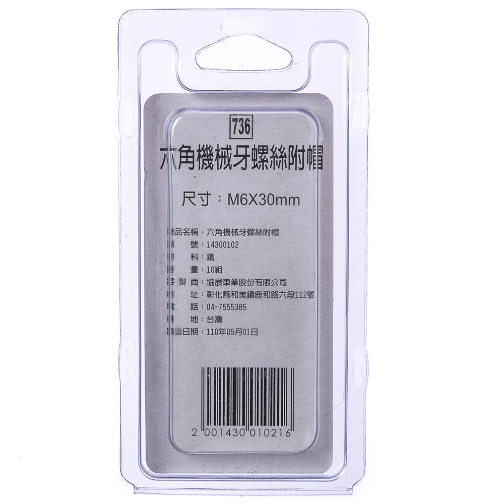 型號736 六角機械牙螺絲 附帽 M6X30mm 10組