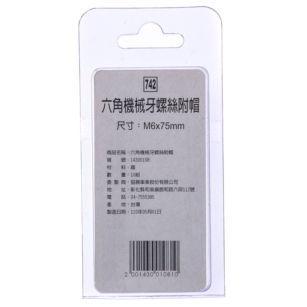 型號742 六角機械牙螺絲 附帽 M6X75mm 10組