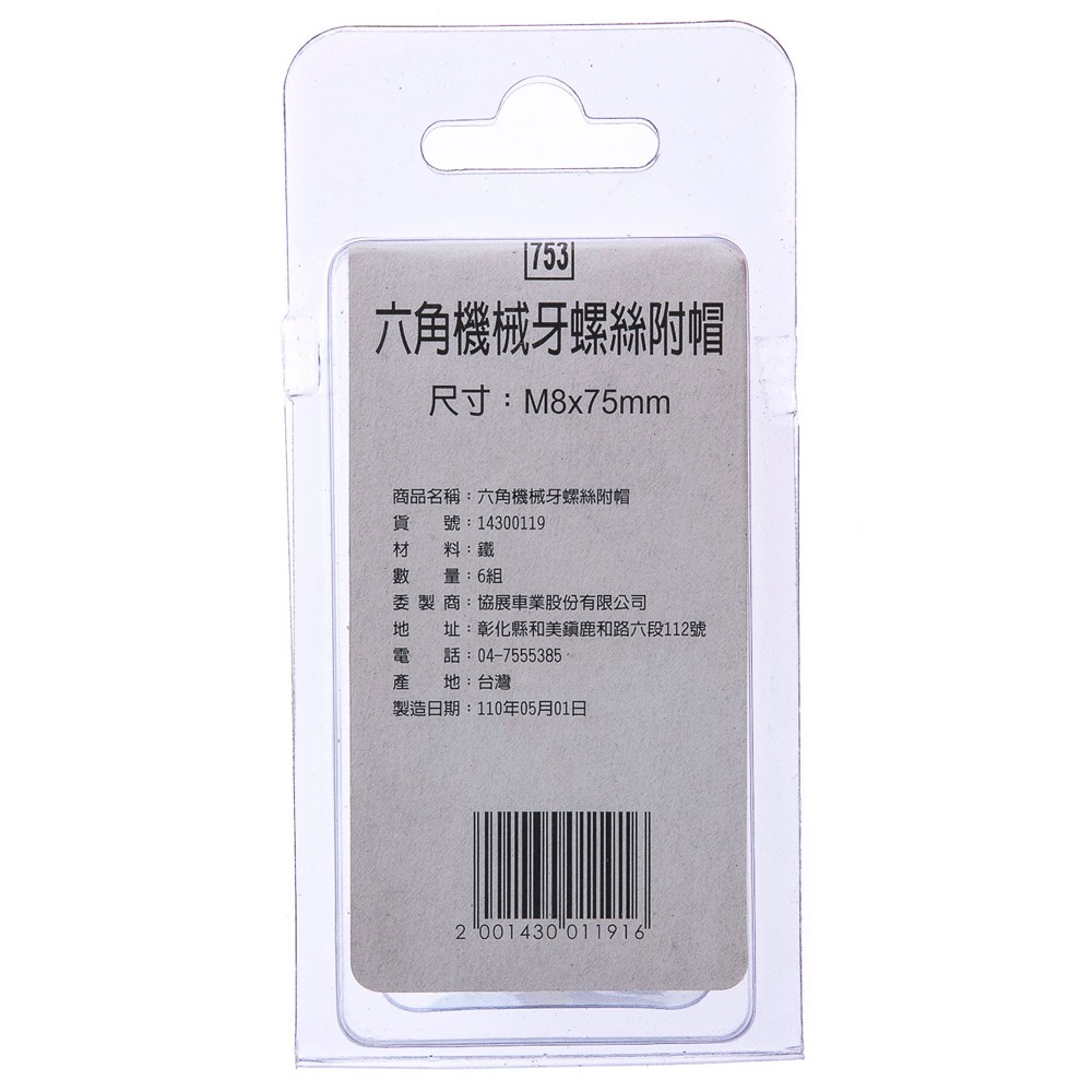 型號753 六角機械牙螺絲 附帽 M8X75mm 6組
