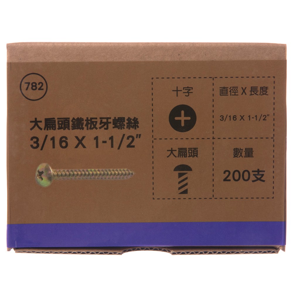 型號782 大扁頭鐵板牙螺絲 3/16X1-1/2" 200支