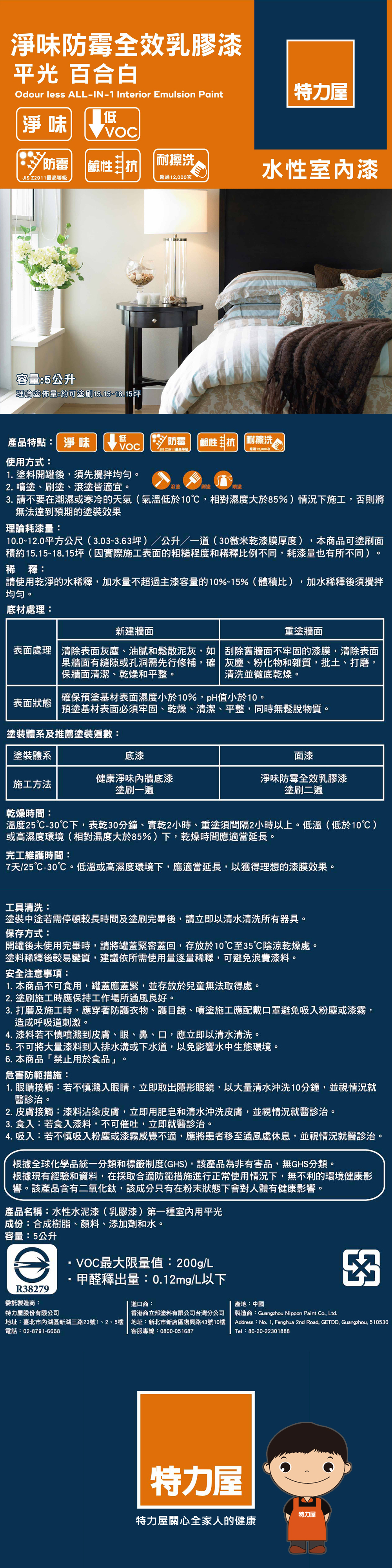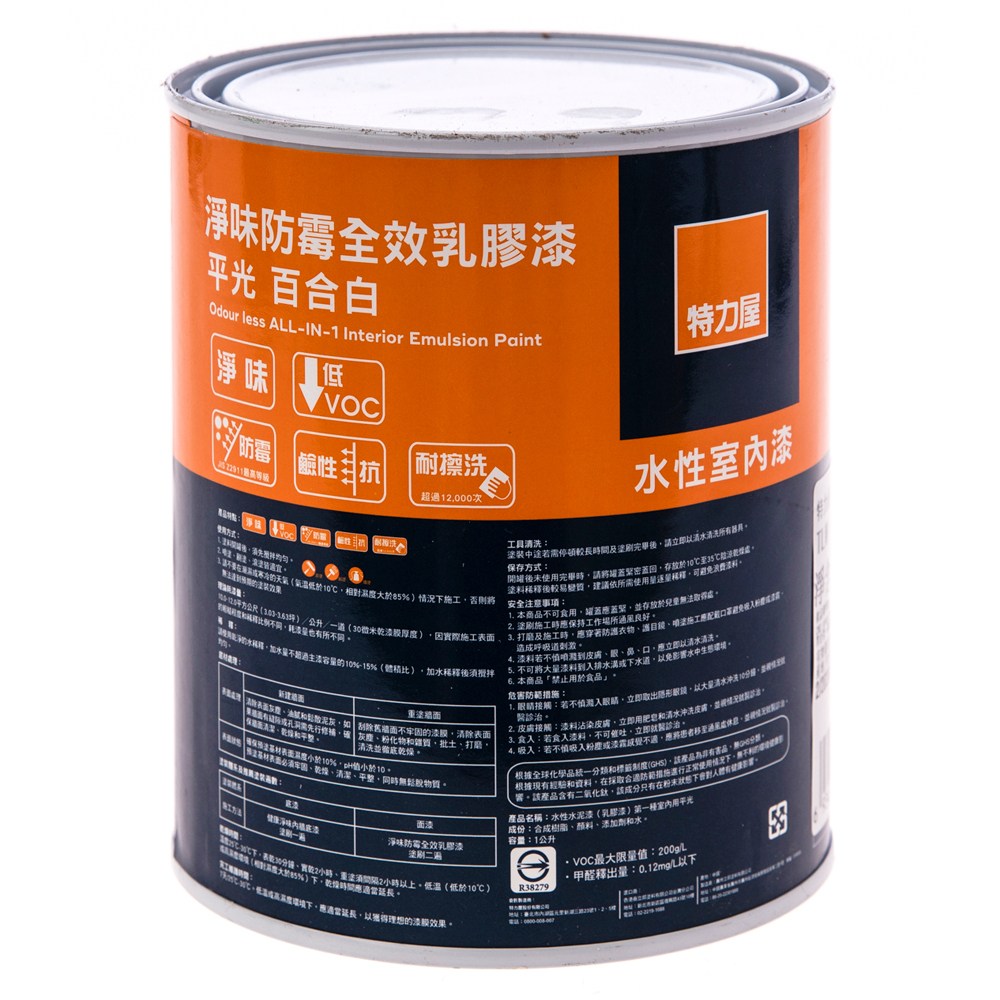 10.0~12.0平方公尺(3.03~3.63坪)╱公升╱一道(30微米乾漆膜厚度),本商品可塗刷面積約15.15~18.15坪(因實際施工表面的粗糙程度和稀釋比例不同,耗漆量也有所不同)。