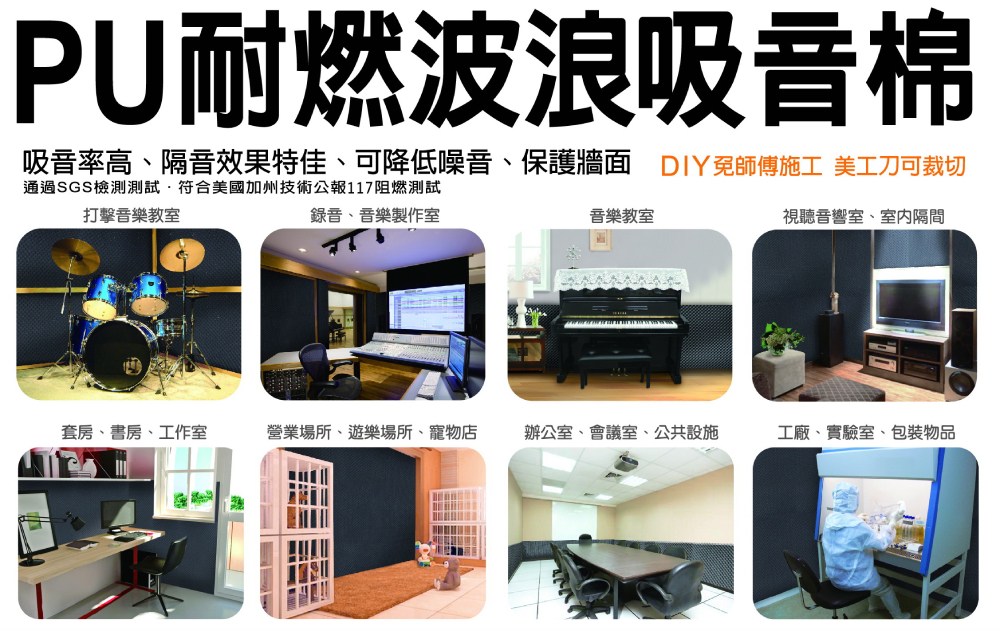 本產品採用PU耐燃波浪泡棉材質,耐燃性佳,隔音、吸音效果佳,也可自行DIY裁切,材質柔軟具有吸震及防震的功能,可適用於工作室、音樂教室、視聽音響室、寵物間、會議室、辦公室、遊樂場所、KTV、音樂廳、醫療病房,耐燃波浪吸音棉使用範圍廣泛,實際依個人發揮創意,自行施作需要吸音隔音的場所。