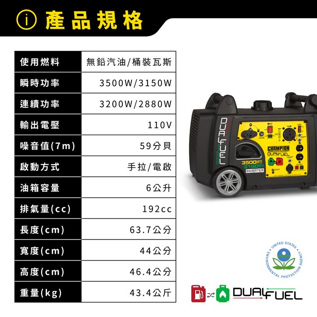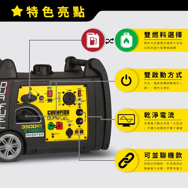 最大輸出功率:汽油3500W/瓦斯3150W