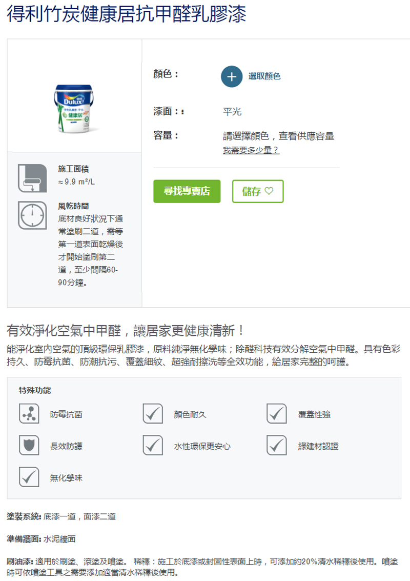 此款【Dulux 得利 竹炭健康居抗甲醛乳膠漆 平光 白色 1L(公升)】運用白竹炭+除醛科技,有效淨化空氣,以精密程序製成之250奈米級白竹炭,有效吸附油漆原料殘存的化學味。