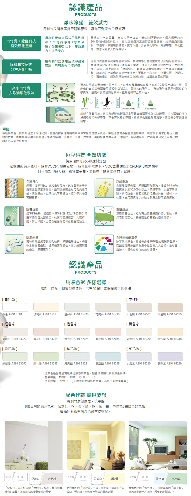 嚴選頂級純淨原料-超低VOC(有機揮發物)、超低化學味的乳膠液及功能添加劑製成,VOC含量遠低於CNS4940國家標準,且不添加甲醛及鉛、汞等重金屬,並獲得「健康綠建材」認證,純淨安全環保。