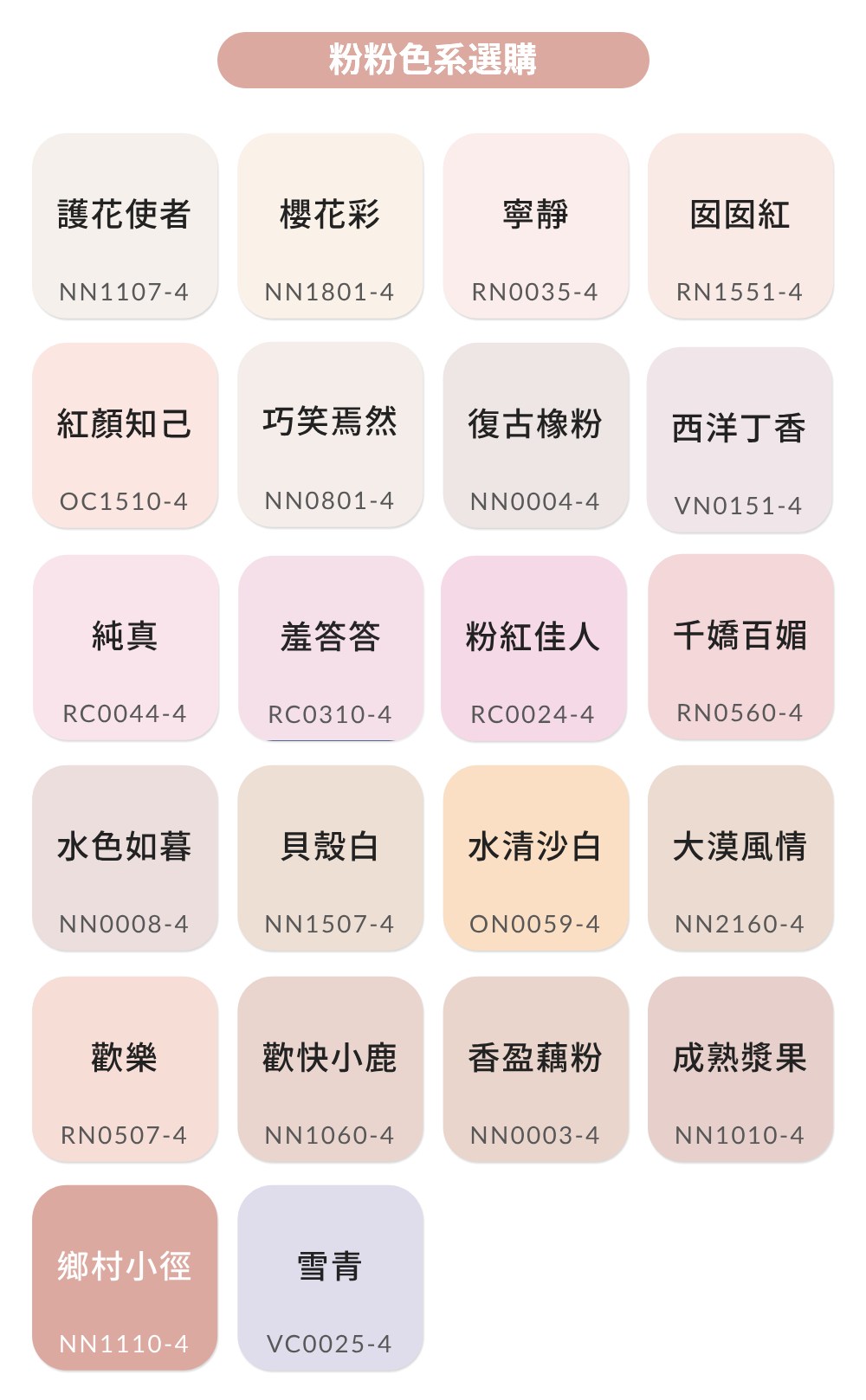 32種標準顏色及931種電腦配色可供選擇 (立邦1988千色卡中,色號尾數字為「-4」的顏色:例如:RC0011-4)