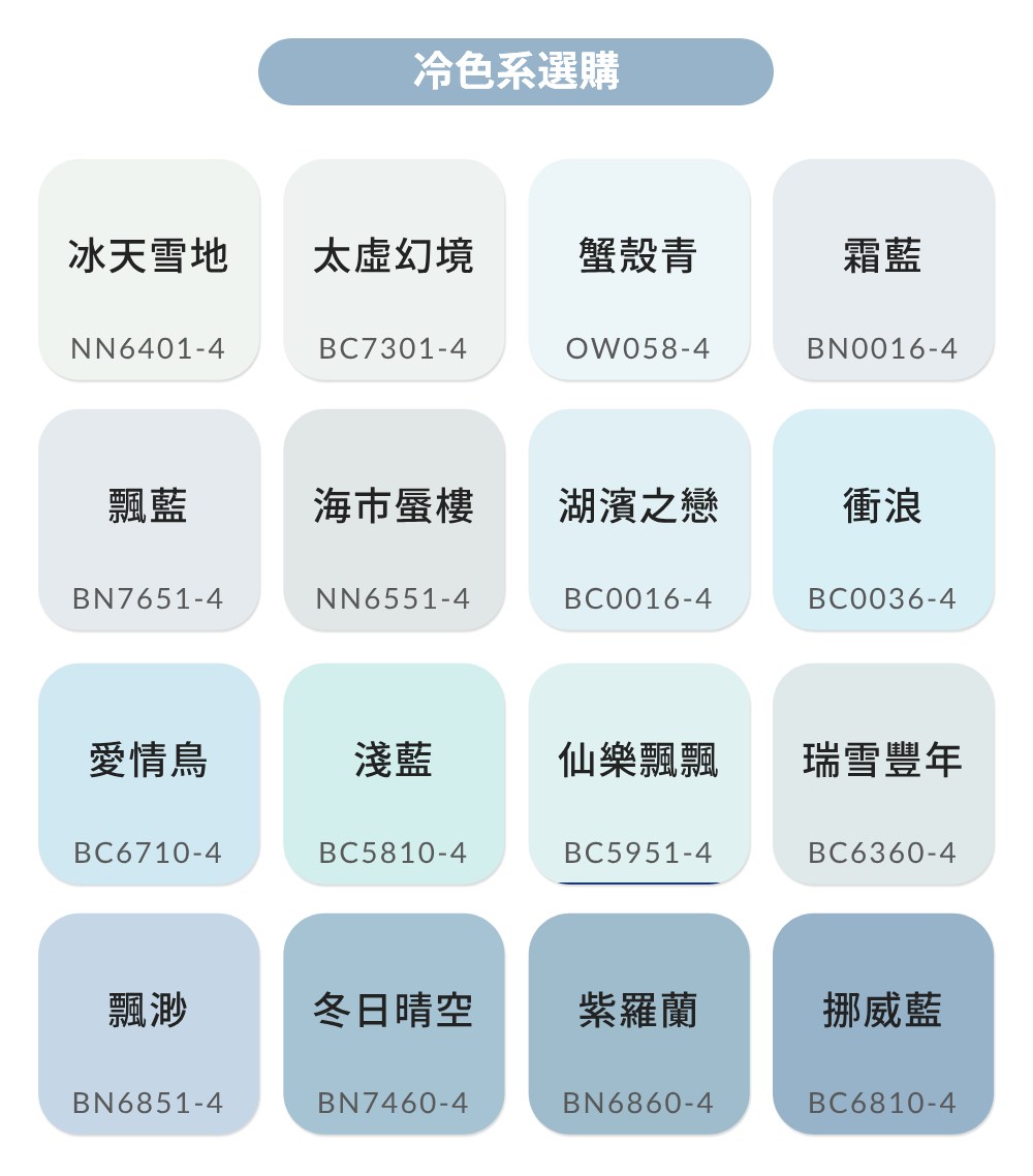 32種標準顏色及931種電腦配色可供選擇 (立邦1988千色卡中,色號尾數字為「-4」的顏色:例如:RC0011-4)
