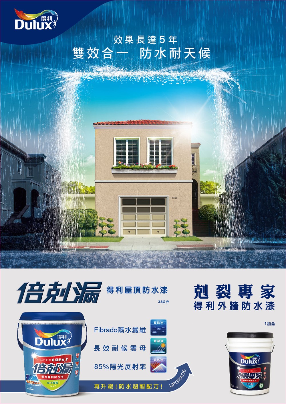 得利倍剋漏屋頂防水漆(A959N):顛覆傳統屋頂防水漆延展性差、日曬易變硬脆化缺點,防水耐天候,效果長達五年。