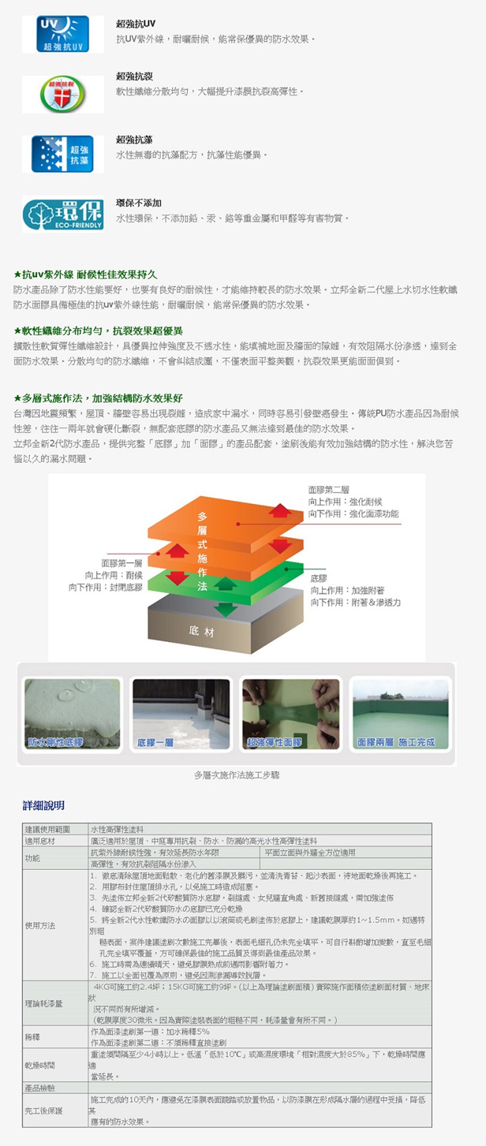本品採全新第二代防水配方,嚴選國際大廠壓克力樹脂、添加特殊抗裂軟纖等原料精製而成,在強化防水性能外,另優化漆膜提升「抗裂、抗水解、抗藻、耐候抗UV、抗傳導熱」等功能。全新2代5合1水性軟纖防水の面膠塗料固化成膜後,能形成具厚度、光澤度高、不易髒污之彈性體,抗UV紫外線功能大幅提升。擴散性軟質彈性纖維設計,具優異的拉伸強度及不透水性,能填補地面及牆面的隙縫,有效阻隔水份滲透,達到全面防水效果。而它良好的遮蓋力,可輕鬆完成美觀的防水塗佈面。塗刷順暢又省力,不論專業施工或自己DIY都適宜!