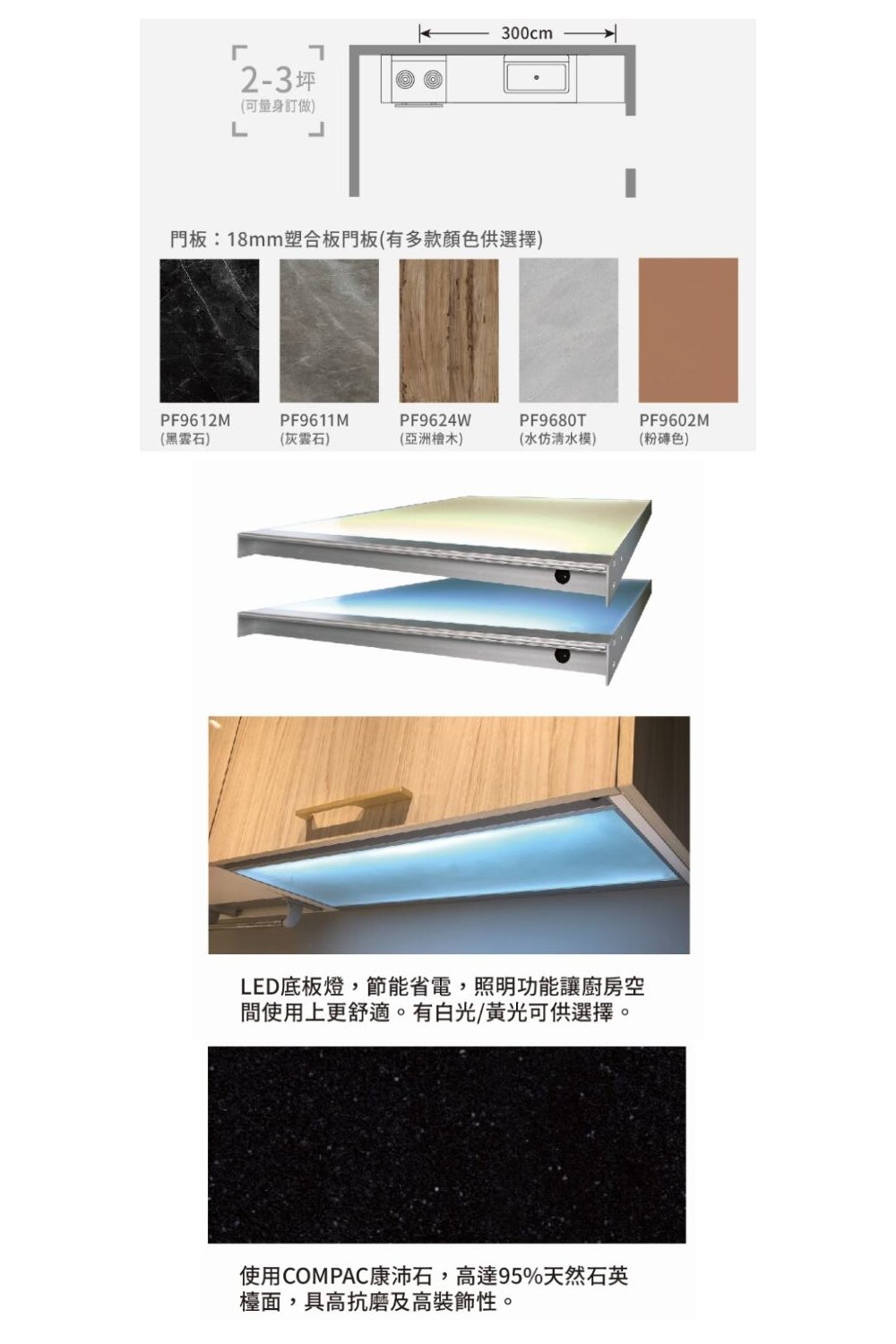 基本尺寸210cm廚具含西班牙芬薩塑合門板、歐化桶身、美耐板檯面,參考價$47,500起。