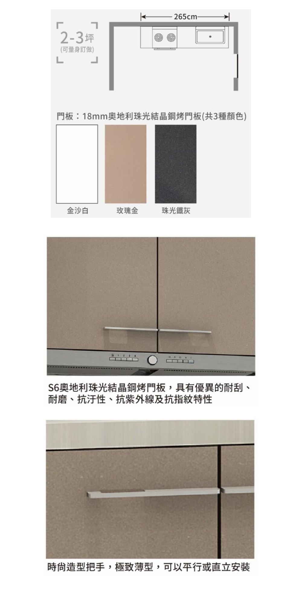 基本尺寸210cm廚具含珠光結烤門板、歐化桶身、美耐板檯面,參考價$58,500起。(以上價格不含三機、廚用五金、龍頭、水槽及展示品)