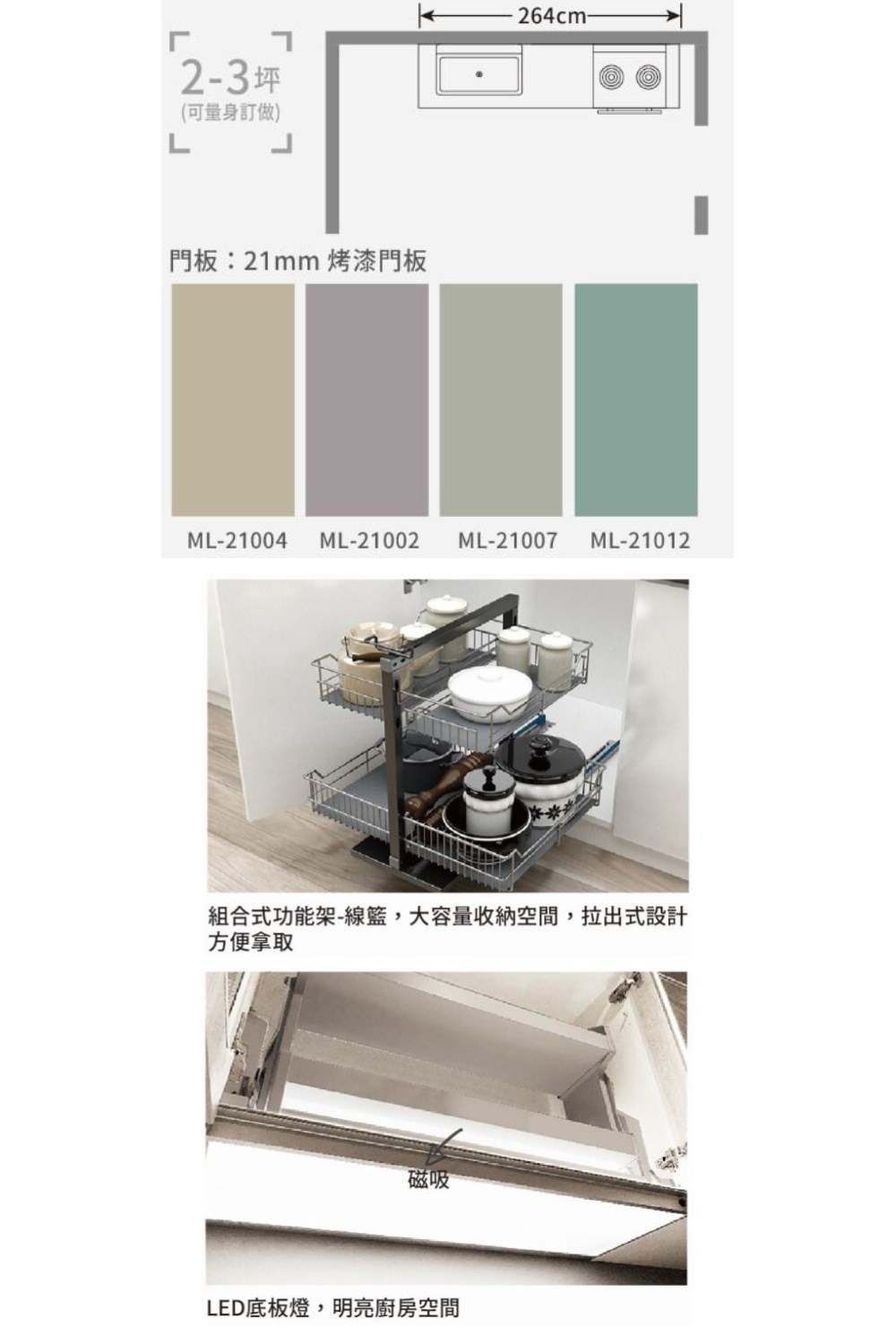 基本尺寸210CM廚具含六面陶瓷烤漆門板、歐化桶身、美耐板檯面,參考價$62,200起。
