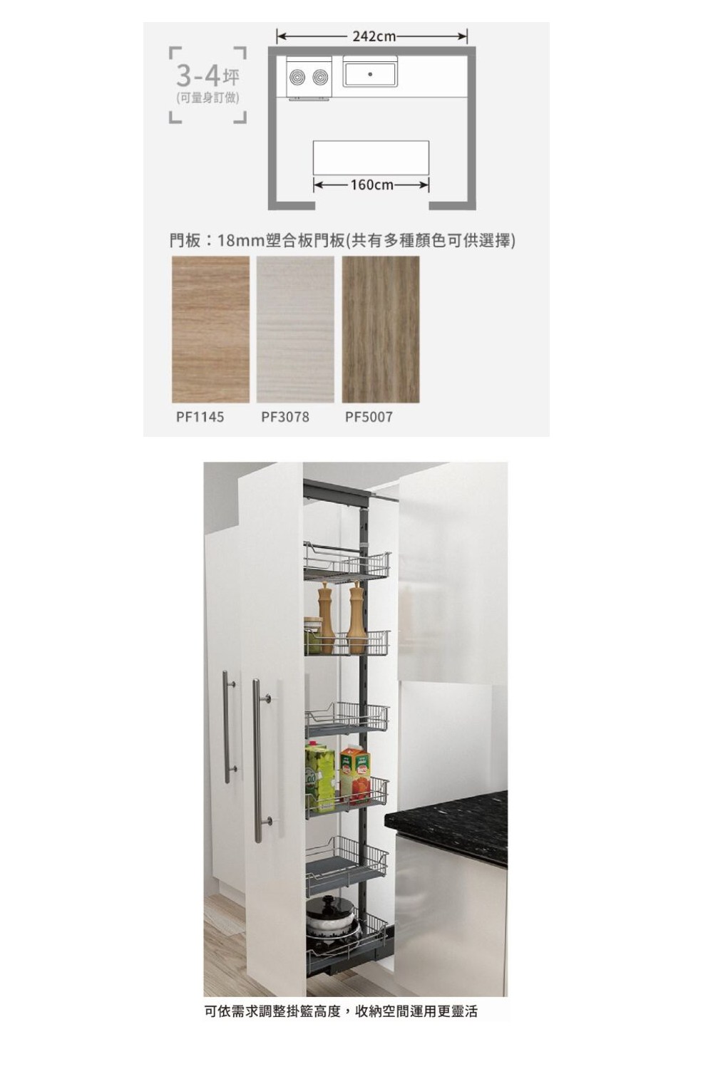基本尺寸210cm廚具含塑合板門板、歐化桶身、美耐板檯面,參考價$42,200起。(以上價格不含三機、廚用五金、龍頭、水槽及展示品)