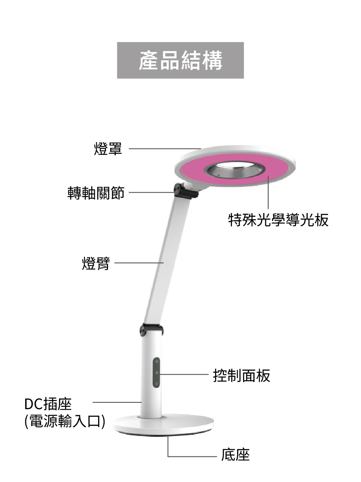 亮度調整功能鍵: 短觸此調整鍵,檯燈亮度分四檔調整,長觸此調整鍵檯燈亮度無段調整。
