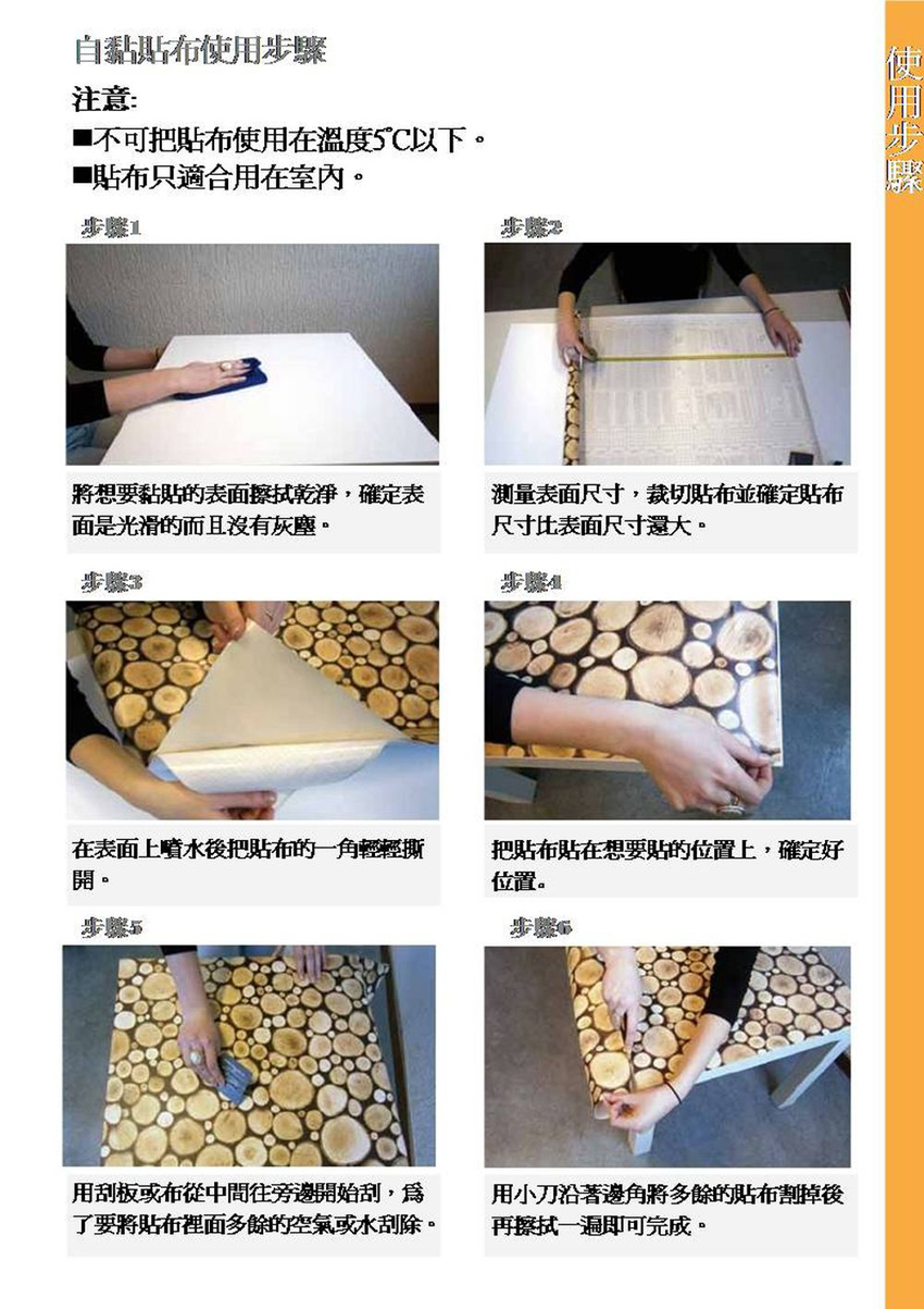 黏貼大面積時,請先噴溼表面,易於調整。