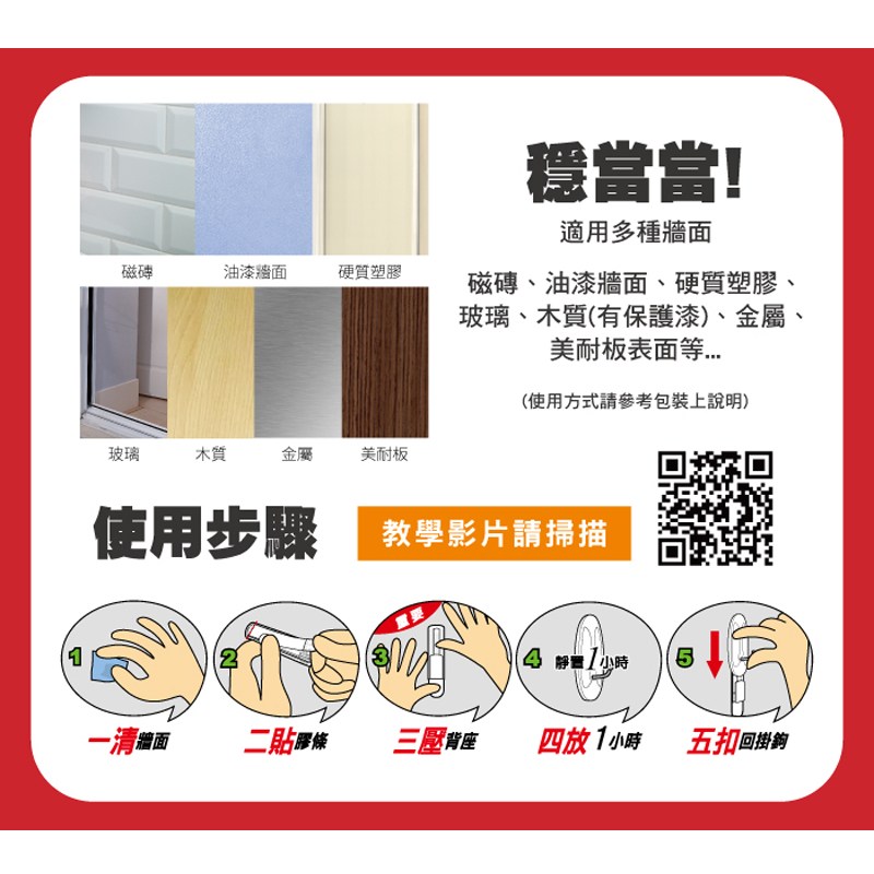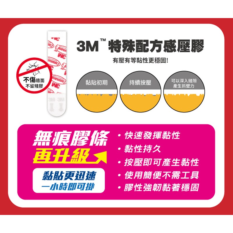 3M無痕掛勾系列,不論是黏著在任何質材牆面上使用後除下都不會在牆上留下殘餘膠質,讓居家環境不受使用掛勾上有任何的影響,而且此系列掛勾可承受重量可是完全超乎您所想像。可承受2.25kg的重量,讓您使用更便利!
