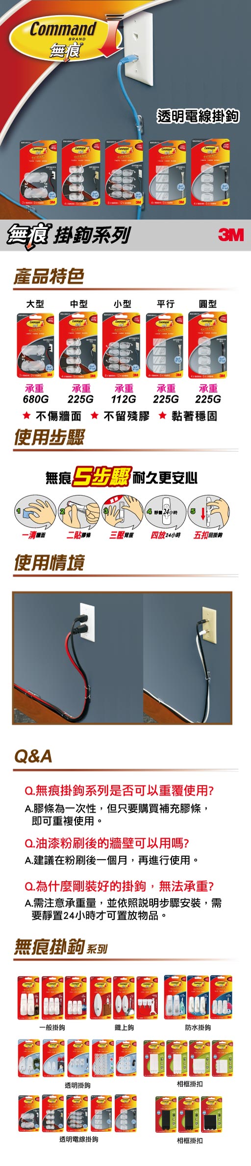 這款【3M 無痕透明大型電線掛鉤】3M專利無痕膠條,粘著穩固;去除時不傷粘著,表面不留殘膠;獨家透明掛鉤膠條,融入環境更美觀;可固定電線使空間整潔。